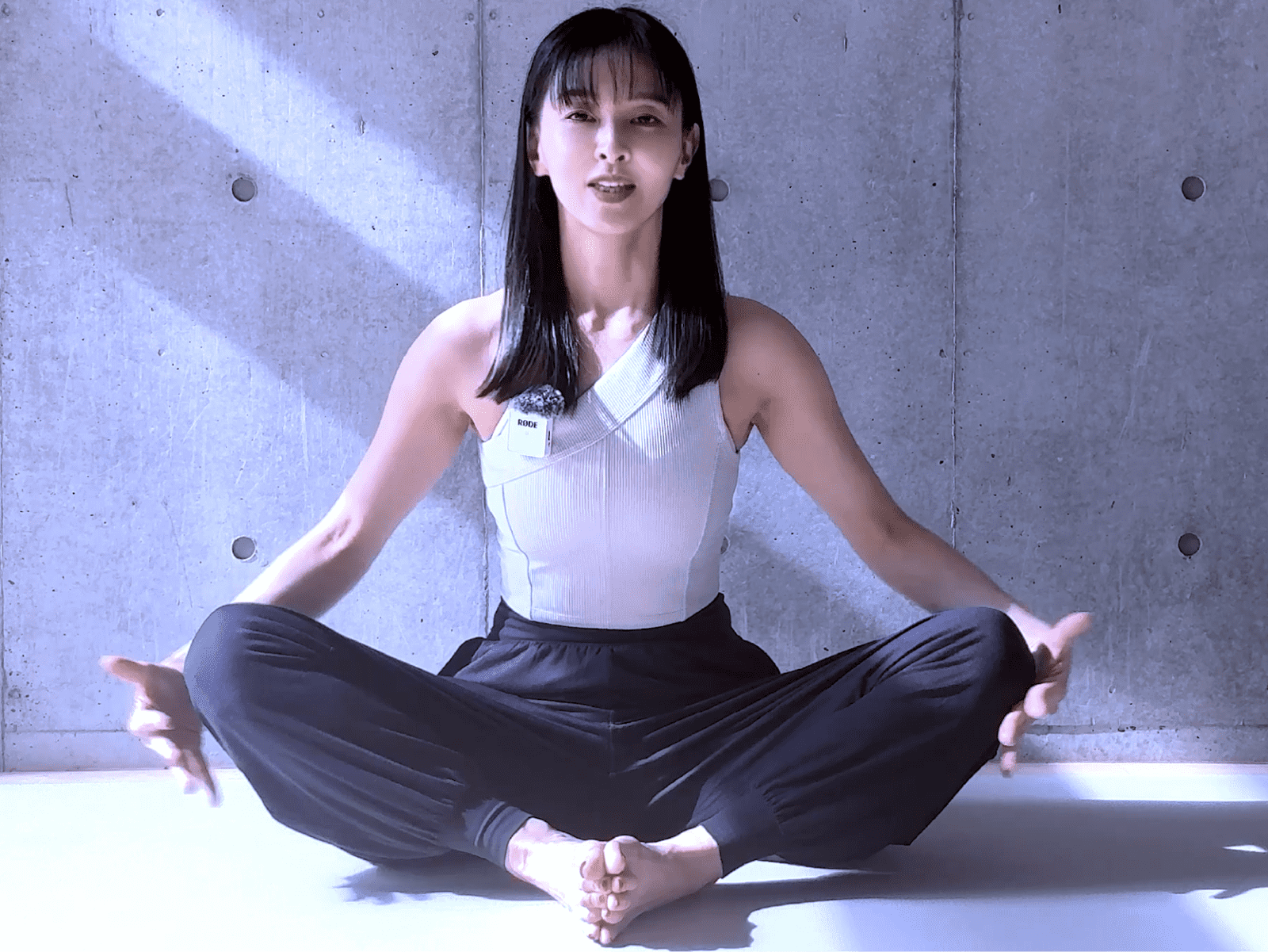 1)床にお尻をつけて座り、膝を曲げて両足の裏を合わせます(塙のポーズベース)。