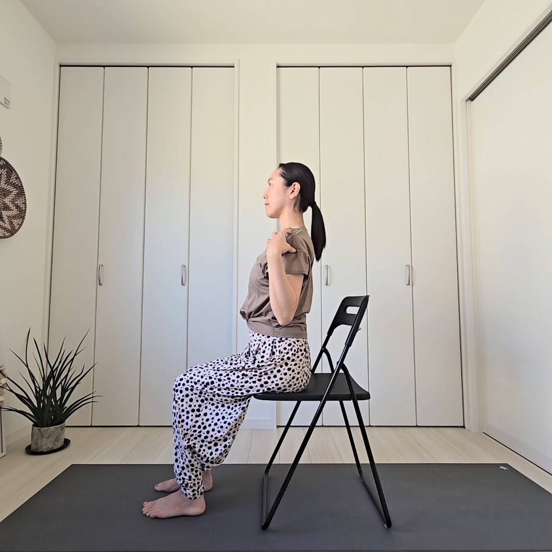 1)椅子に座り、右足の裏を両手でつかむ