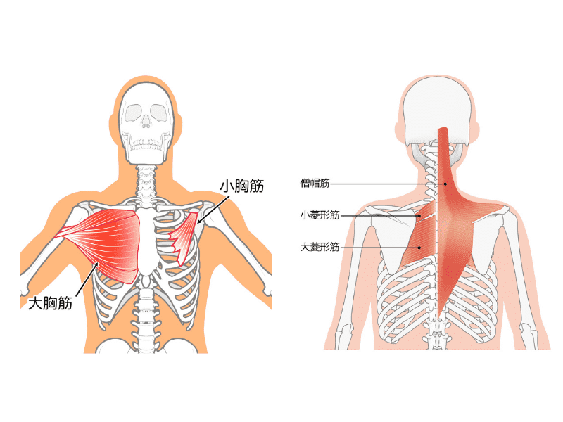 姿勢を整えるには、胸の前側の大胸筋と、肩甲骨の間にある菱形筋(りょうけいきん)・僧帽筋(そうぼうきん)を意識することが大切です。大胸筋が縮こまると、肩が前に引っ張られて猫背になりやすく、呼吸も浅くなります。