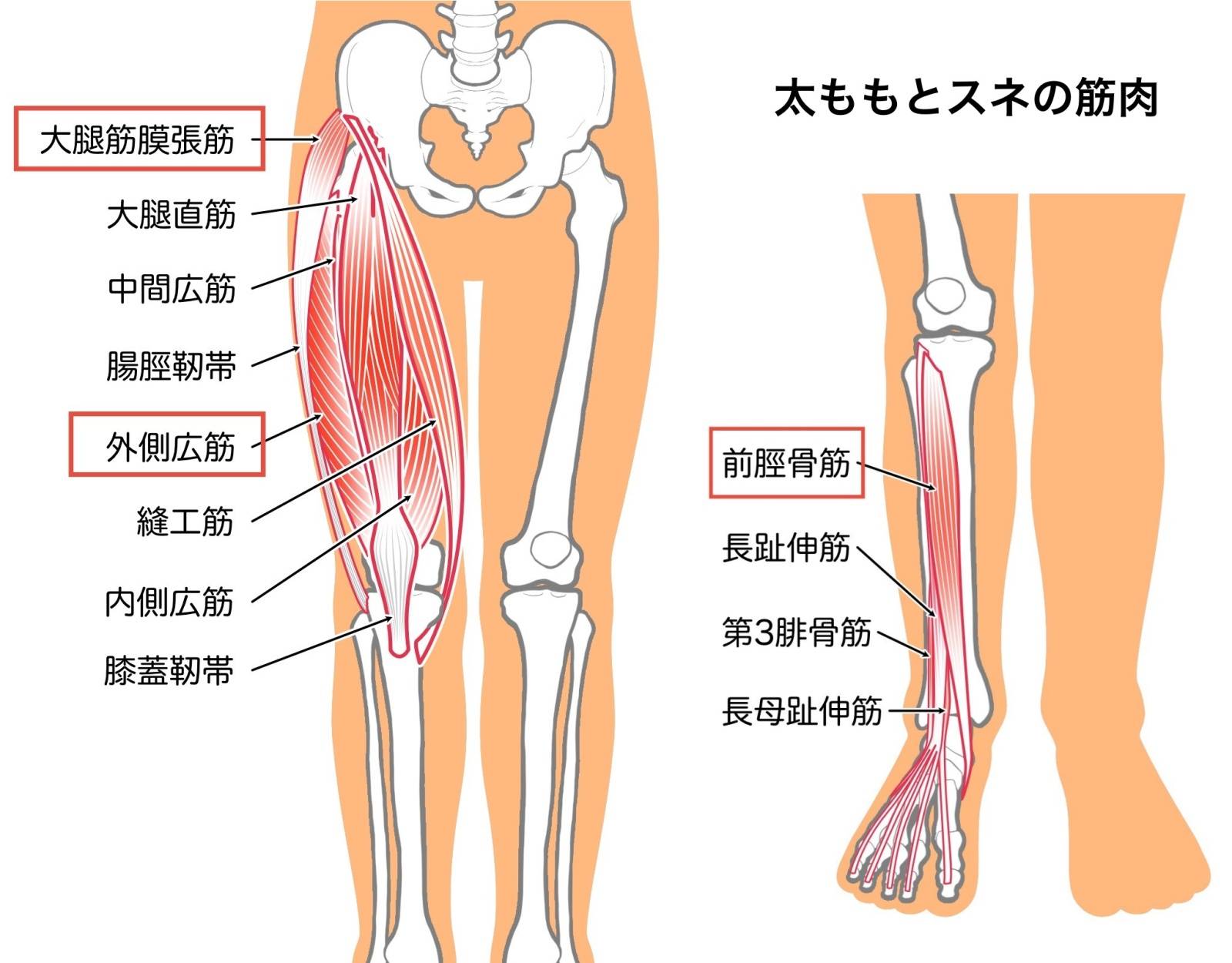 太ももの外側が張ってしまう原因としてまず考えられるのは、「太ももの外側の筋肉の使いすぎ」。太ももの外側には外側広筋・大腿筋膜張筋という筋肉や、腸脛靭帯があり、これらは膝を安定させる役割を持っています。